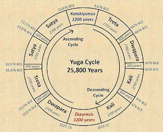Others also differ in their opinions of where we are in the cycle. Many might follow the view of Sri Yukteswar, the guru of Paramahansa Yogananda, who claimed in his book The Holy Science that we are in the ascending Treta Yuga. (He did identify the Yuga Cycle with the precessional cycle, but put us in the ascending half of the cycle. As much as people may deify Yogananda and hence his master, Sri Yukteswar, and as spiritually developed as they were, they were still human beings and liable to human faults, including arrogance.)